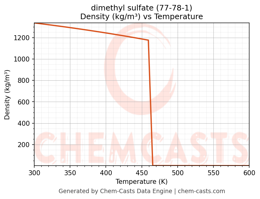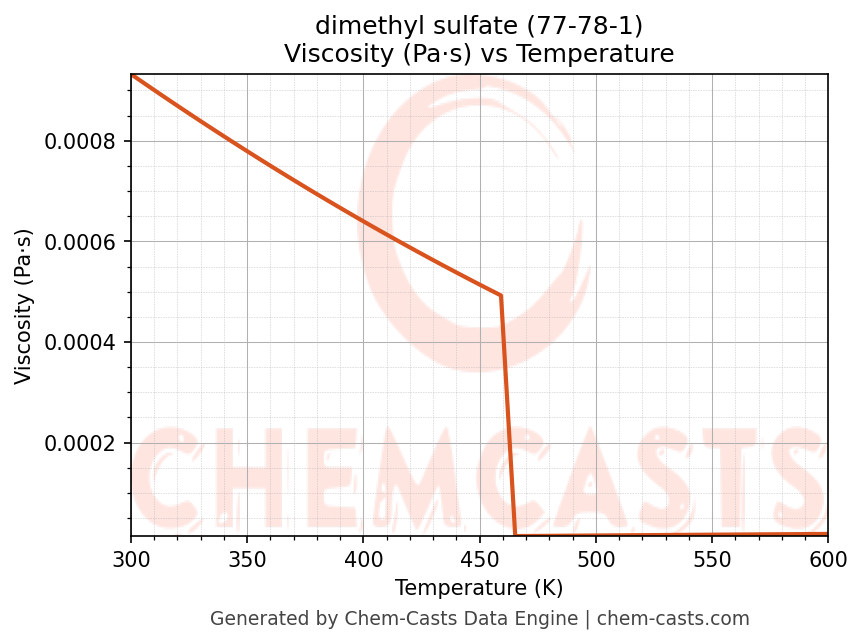 This page presents the temperature-dependent thermodynamic and transport properties of dimethyl sulfate (CAS 77-78-1) calculated at a constant pressure of 1 atm (101325 Pa) over the temperature range 250-500 K.