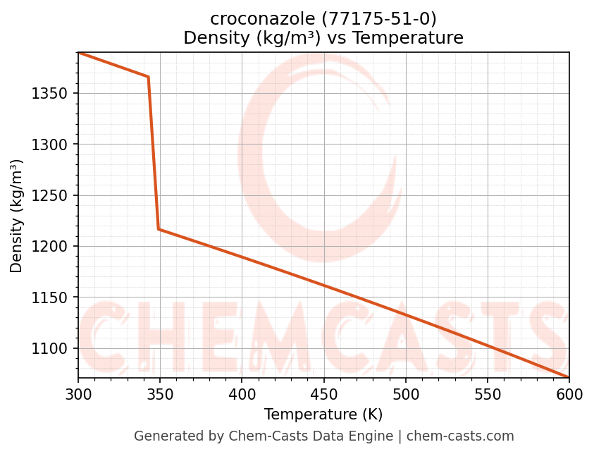 This page presents the temperature-dependent thermodynamic and transport properties of croconazole (CAS 77175-51-0) calculated at a constant pressure of 1 atm (101325 Pa) over the temperature range 250-500 K.