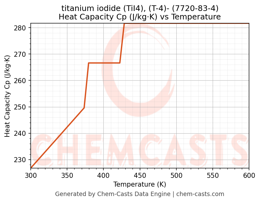 This page presents the temperature-dependent thermodynamic and transport properties of titanium iodide (TiI4), (T-4)- (CAS 7720-83-4) calculated at a constant pressure of 1 atm (101325 Pa) over the temperature range 250-500 K.