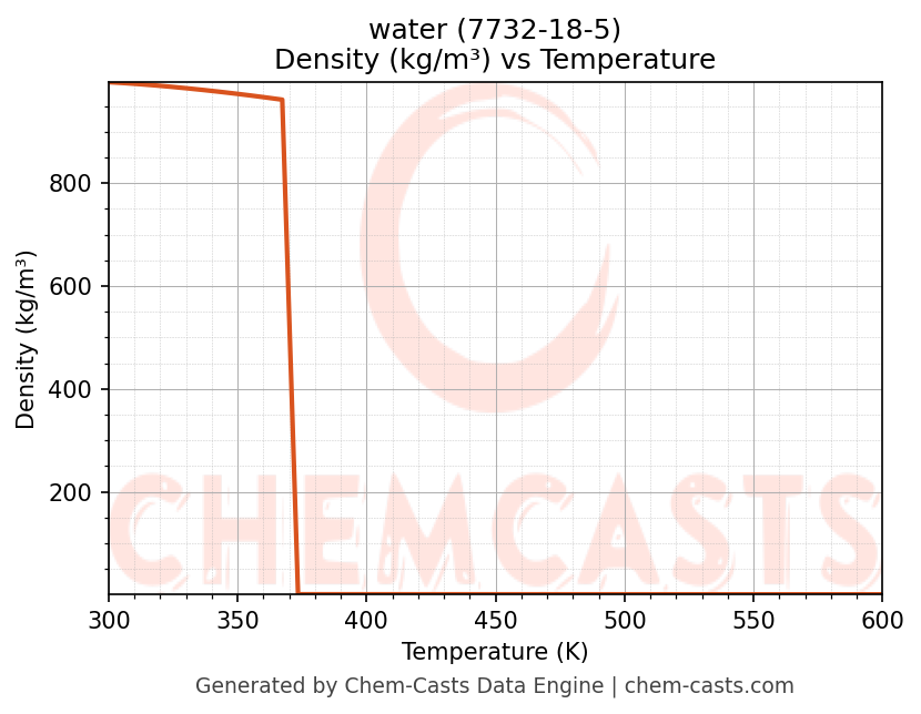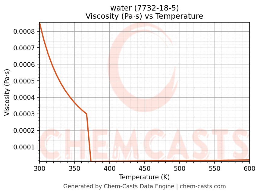 This page presents the temperature-dependent thermodynamic and transport properties of water (CAS 7732-18-5) calculated at a constant pressure of 1 atm (101325 Pa) over the temperature range 250-500 K.