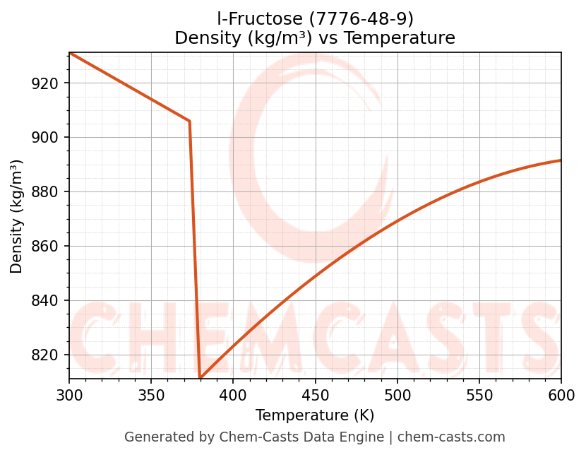 This page presents the temperature-dependent thermodynamic and transport properties of l-Fructose (CAS 7776-48-9) calculated at a constant pressure of 1 atm (101325 Pa) over the temperature range 250-500 K.