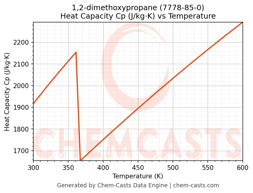 - Specific heat capacity (Cp) indicates the amount of energy required to raise the temperature of 1,2-dimethoxypropane and is critical for energy balance and heat-exchanger design.
