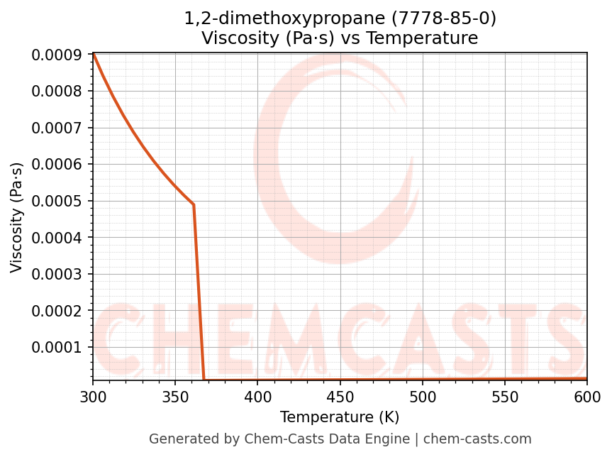 This page presents the temperature-dependent thermodynamic and transport properties of 1,2-dimethoxypropane (CAS 7778-85-0) calculated at a constant pressure of 1 atm (101325 Pa) over the temperature range 250-500 K.