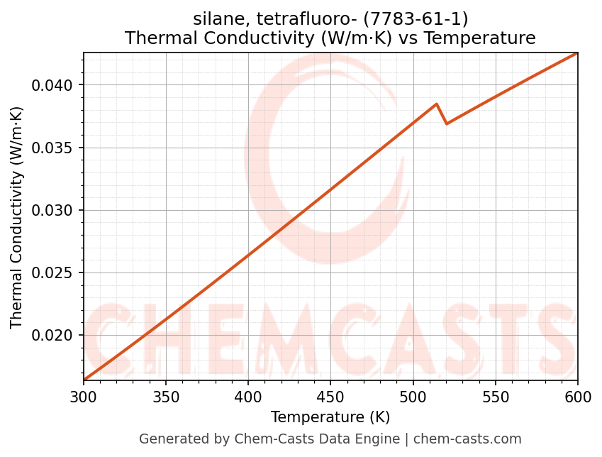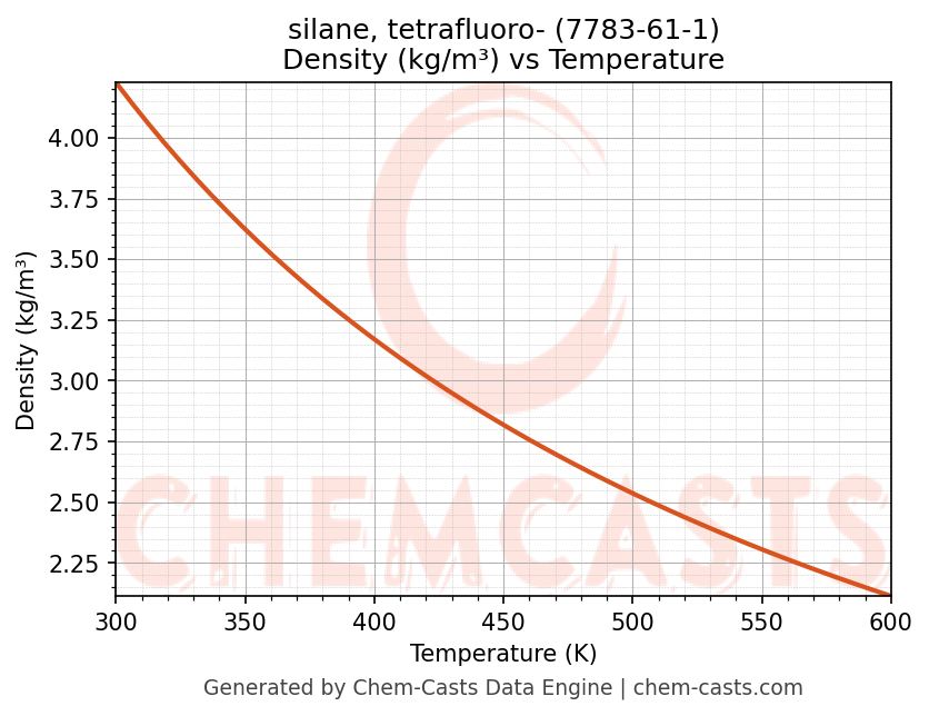 This page presents the temperature-dependent thermodynamic and transport properties of silane, tetrafluoro- (CAS 7783-61-1) calculated at a constant pressure of 1 atm (101325 Pa) over the temperature range 250-500 K.