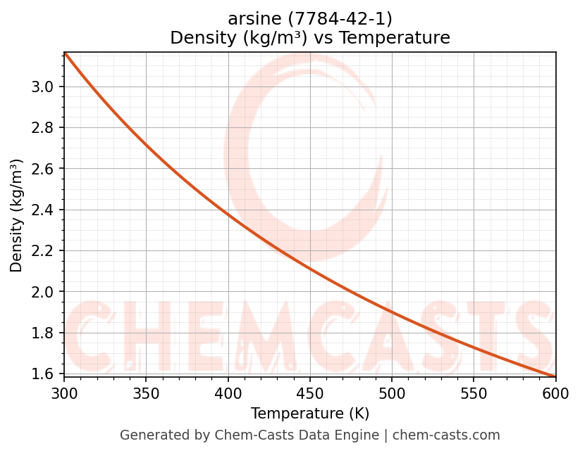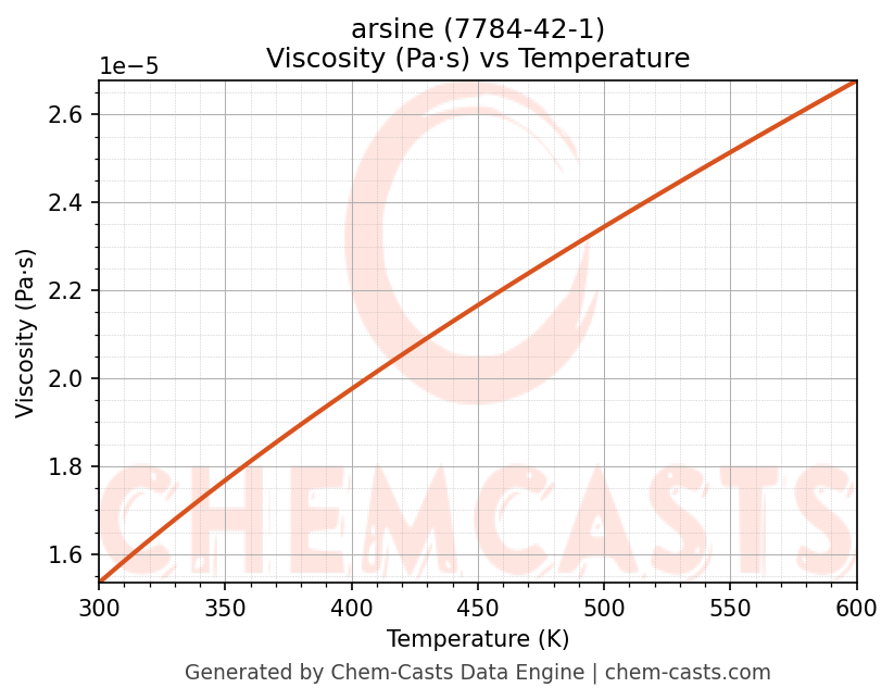 This page presents the temperature-dependent thermodynamic and transport properties of arsine (CAS 7784-42-1) calculated at a constant pressure of 1 atm (101325 Pa) over the temperature range 250-500 K.