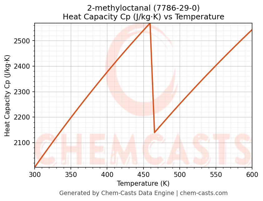 - Specific heat capacity (Cp) indicates the amount of energy required to raise the temperature of 2-methyloctanal and is critical for energy balance and heat-exchanger design.