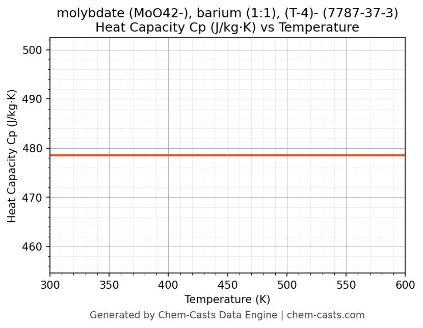 - Specific heat capacity (Cp) indicates the amount of energy required to raise the temperature of molybdate (MoO42-), barium (1:1), (T-4)- and is critical for energy balance and heat-exchanger design.
