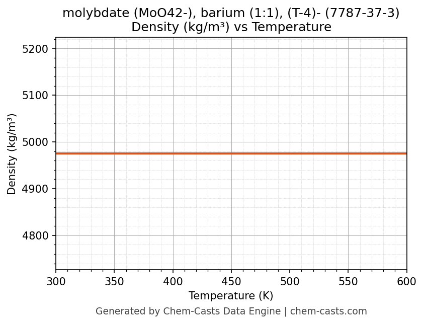 This page presents the temperature-dependent thermodynamic and transport properties of molybdate (MoO42-), barium (1:1), (T-4)- (CAS 7787-37-3) calculated at a constant pressure of 1 atm (101325 Pa) over the temperature range 250-500 K.
