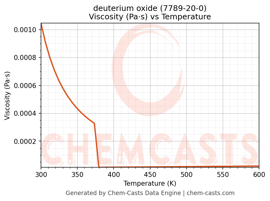 This page presents the temperature-dependent thermodynamic and transport properties of deuterium oxide (CAS 7789-20-0) calculated at a constant pressure of 1 atm (101325 Pa) over the temperature range 250-500 K.