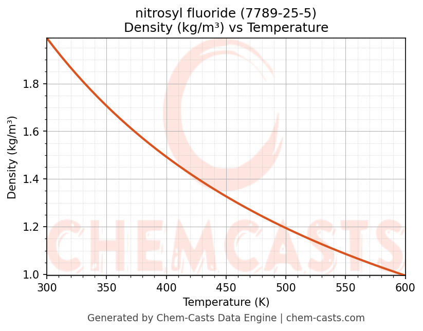 This page presents the temperature-dependent thermodynamic and transport properties of nitrosyl fluoride (CAS 7789-25-5) calculated at a constant pressure of 1 atm (101325 Pa) over the temperature range 250-500 K.
