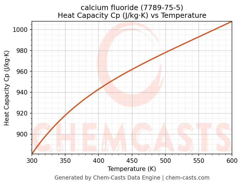 - Specific heat capacity (Cp) indicates the amount of energy required to raise the temperature of calcium fluoride and is critical for energy balance and heat-exchanger design.