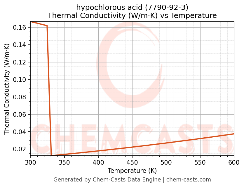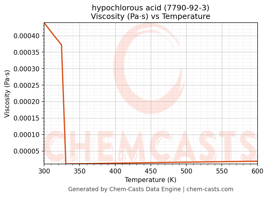This page presents the temperature-dependent thermodynamic and transport properties of hypochlorous acid (CAS 7790-92-3) calculated at a constant pressure of 1 atm (101325 Pa) over the temperature range 250-500 K.