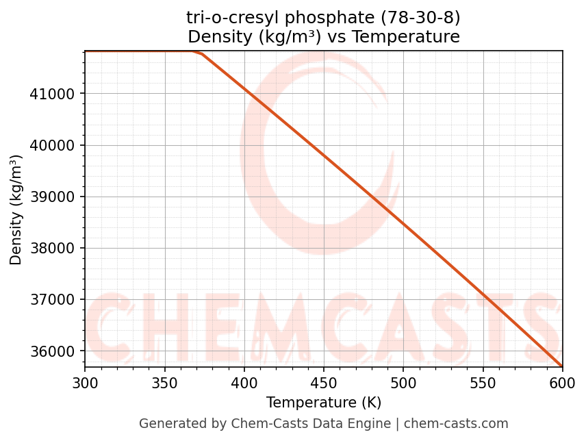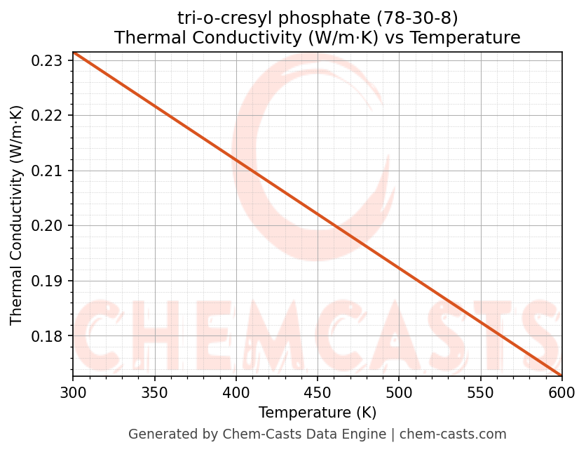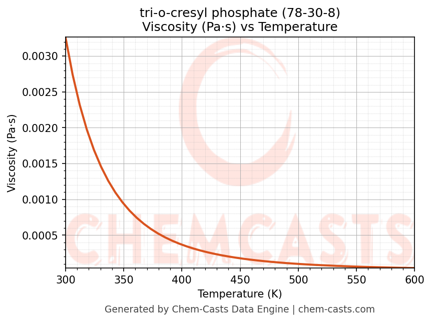 This page presents the temperature-dependent thermodynamic and transport properties of tri-o-cresyl phosphate (CAS 78-30-8) calculated at a constant pressure of 1 atm (101325 Pa) over the temperature range 250-500 K.