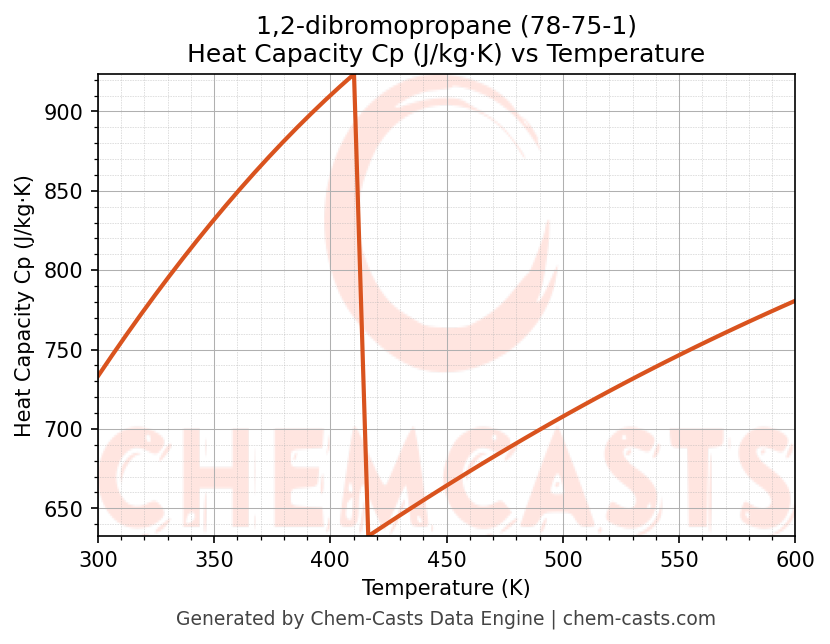 - Specific heat capacity (Cp) indicates the amount of energy required to raise the temperature of 1,2-dibromopropane and is critical for energy balance and heat-exchanger design.