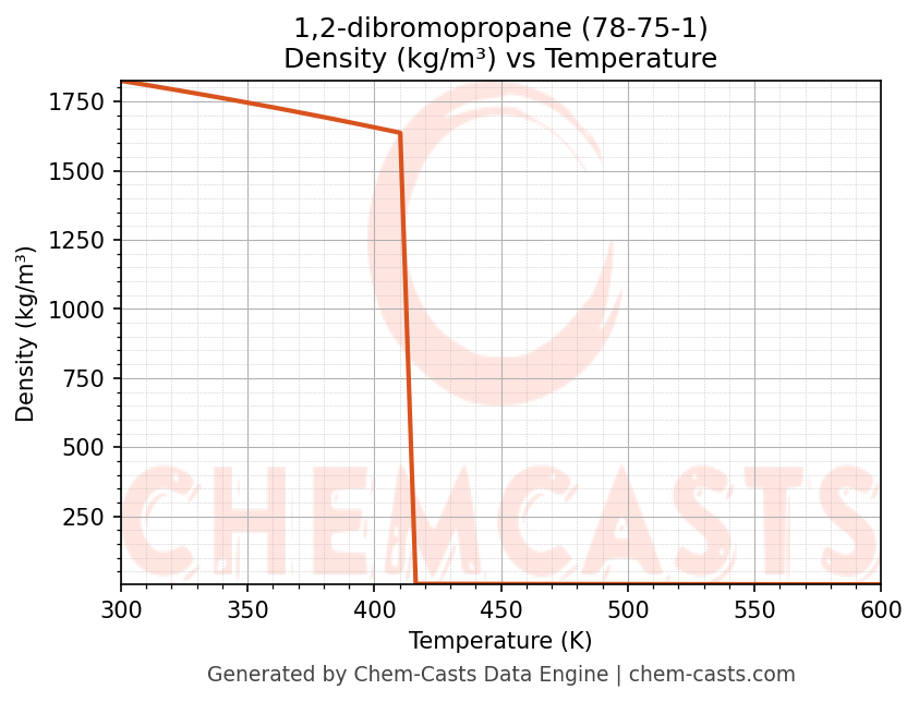 This page presents the temperature-dependent thermodynamic and transport properties of 1,2-dibromopropane (CAS 78-75-1) calculated at a constant pressure of 1 atm (101325 Pa) over the temperature range 250-500 K.