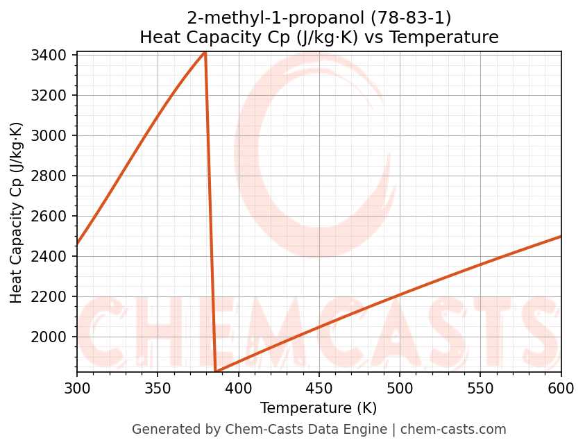 - Specific heat capacity (Cp) indicates the amount of energy required to raise the temperature of 2-methyl-1-propanol and is critical for energy balance and heat-exchanger design.