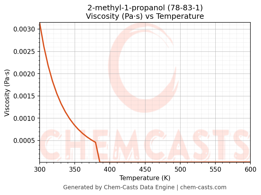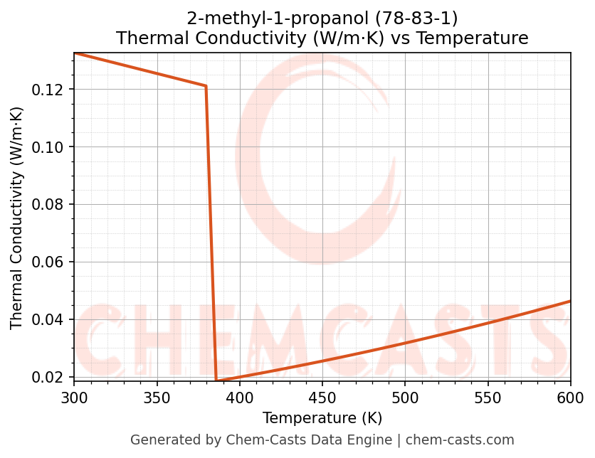 This page presents the temperature-dependent thermodynamic and transport properties of 2-methyl-1-propanol (CAS 78-83-1) calculated at a constant pressure of 1 atm (101325 Pa) over the temperature range 250-500 K.