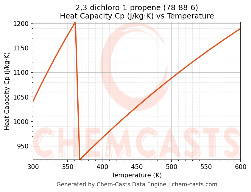 - Specific heat capacity (Cp) indicates the amount of energy required to raise the temperature of 2,3-dichloro-1-propene and is critical for energy balance and heat-exchanger design.