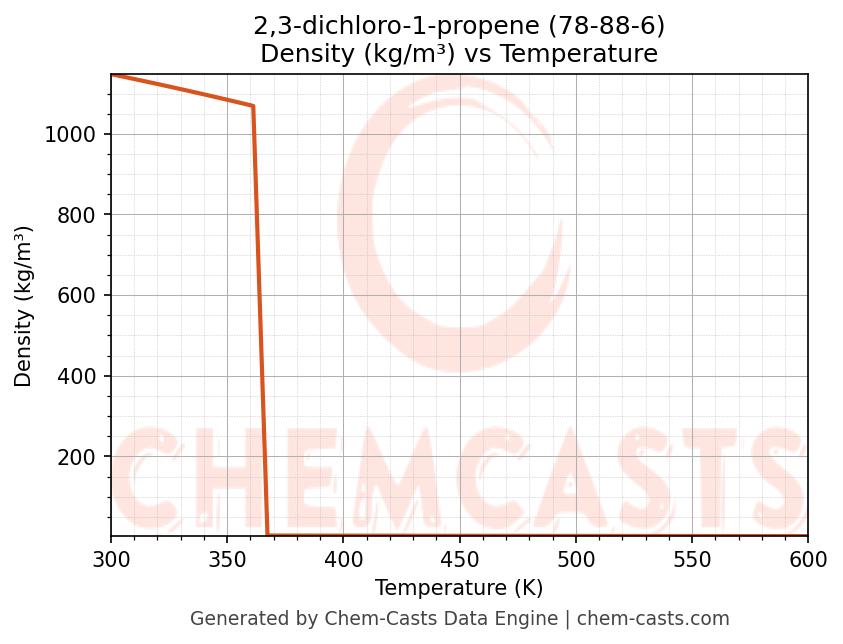 This page presents the temperature-dependent thermodynamic and transport properties of 2,3-dichloro-1-propene (CAS 78-88-6) calculated at a constant pressure of 1 atm (101325 Pa) over the temperature range 250-500 K.