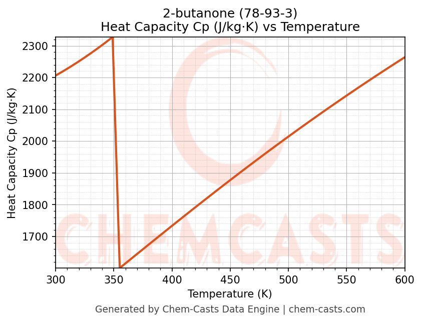 - Specific heat capacity (Cp) indicates the amount of energy required to raise the temperature of 2-butanone and is critical for energy balance and heat-exchanger design.