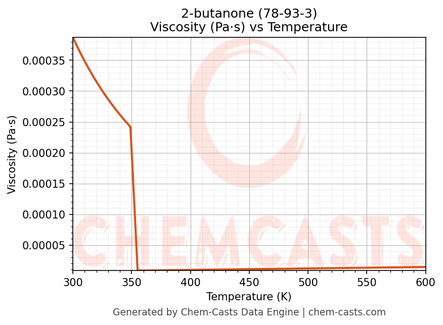 This page presents the temperature-dependent thermodynamic and transport properties of 2-butanone (CAS 78-93-3) calculated at a constant pressure of 1 atm (101325 Pa) over the temperature range 250-500 K.