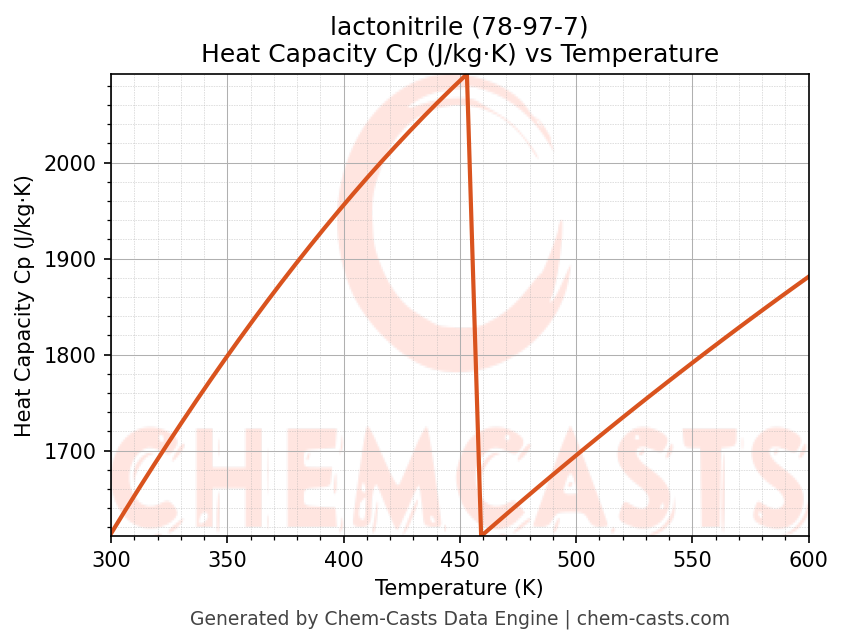 - Specific heat capacity (Cp) indicates the amount of energy required to raise the temperature of lactonitrile and is critical for energy balance and heat-exchanger design.