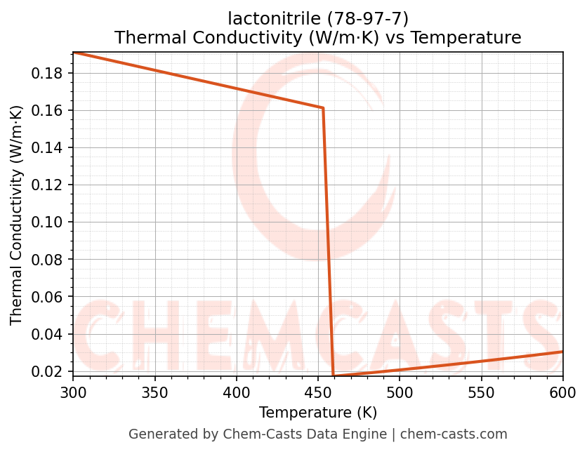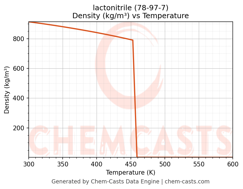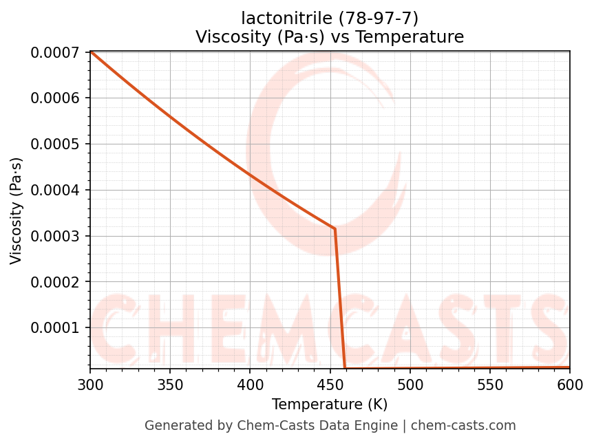 This page presents the temperature-dependent thermodynamic and transport properties of lactonitrile (CAS 78-97-7) calculated at a constant pressure of 1 atm (101325 Pa) over the temperature range 250-500 K.