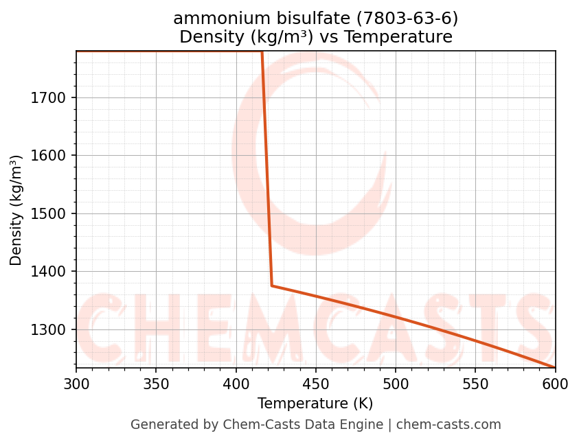 This page presents the temperature-dependent thermodynamic and transport properties of ammonium bisulfate (CAS 7803-63-6) calculated at a constant pressure of 1 atm (101325 Pa) over the temperature range 250-500 K.