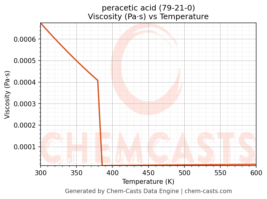This page presents the temperature-dependent thermodynamic and transport properties of peracetic acid (CAS 79-21-0) calculated at a constant pressure of 1 atm (101325 Pa) over the temperature range 250-500 K.