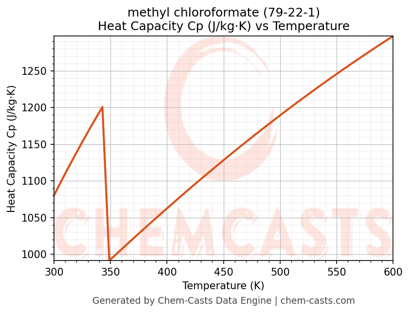 - Specific heat capacity (Cp) indicates the amount of energy required to raise the temperature of methyl chloroformate and is critical for energy balance and heat-exchanger design.