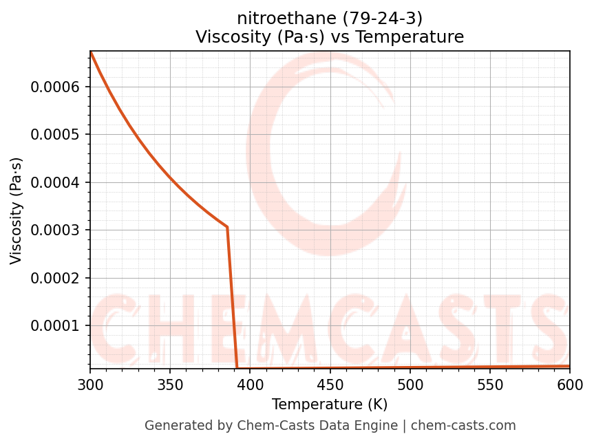 This page presents the temperature-dependent thermodynamic and transport properties of nitroethane (CAS 79-24-3) calculated at a constant pressure of 1 atm (101325 Pa) over the temperature range 250-500 K.