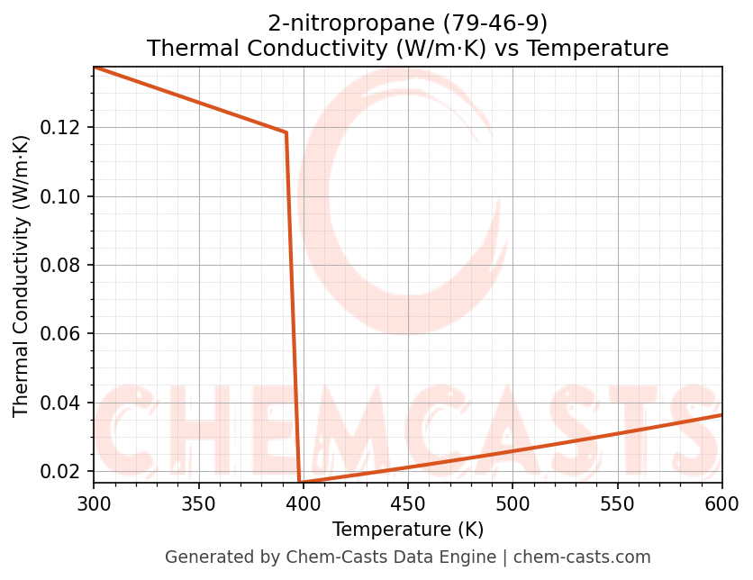 This page presents the temperature-dependent thermodynamic and transport properties of 2-nitropropane (CAS 79-46-9) calculated at a constant pressure of 1 atm (101325 Pa) over the temperature range 250-500 K.