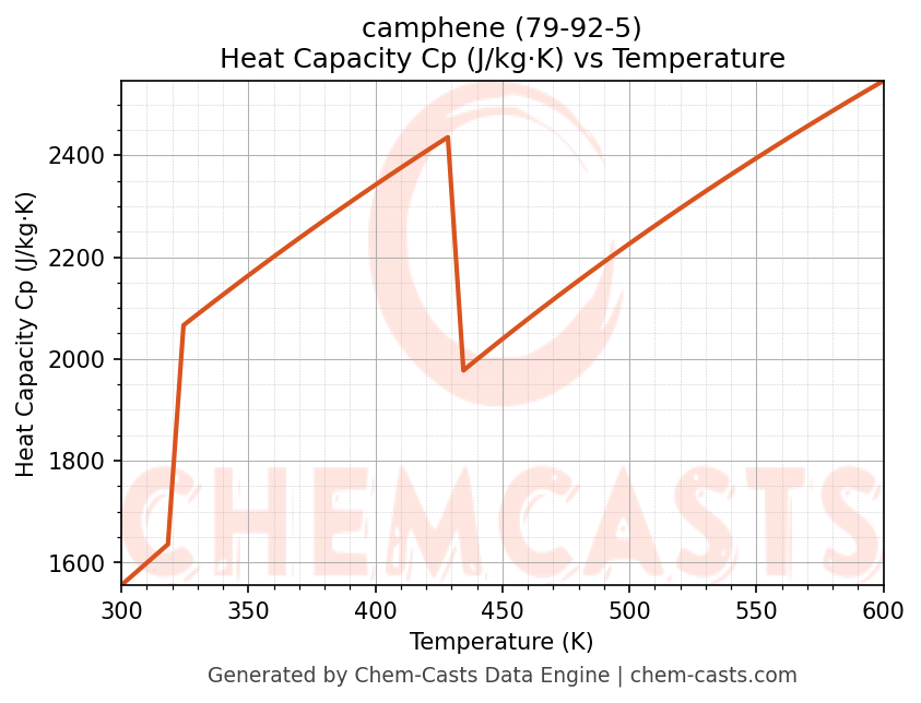 - Specific heat capacity (Cp) indicates the amount of energy required to raise the temperature of camphene and is critical for energy balance and heat-exchanger design.