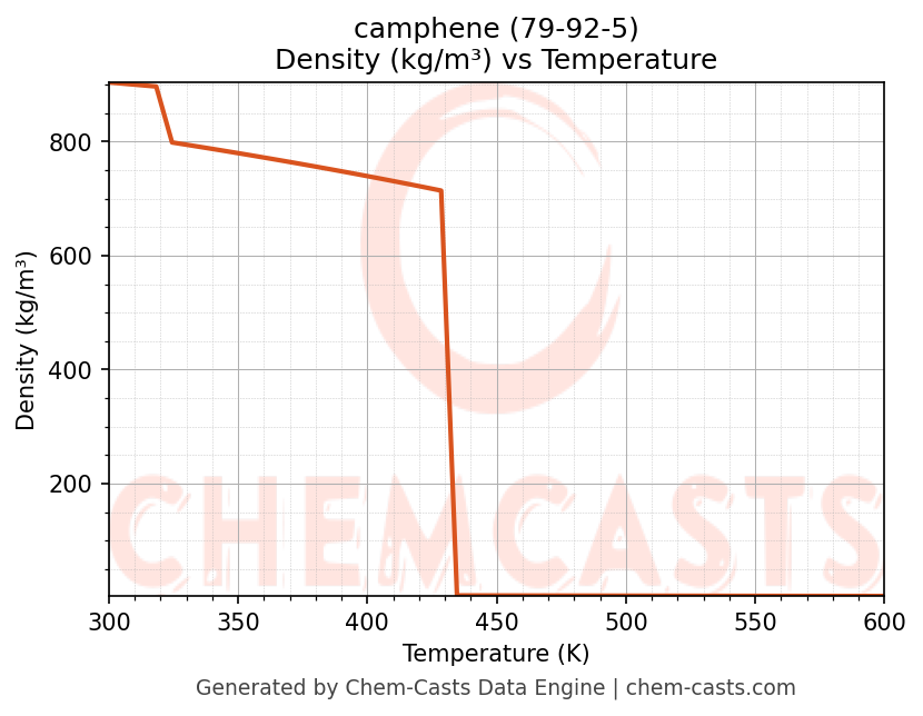 This page presents the temperature-dependent thermodynamic and transport properties of camphene (CAS 79-92-5) calculated at a constant pressure of 1 atm (101325 Pa) over the temperature range 250-500 K.