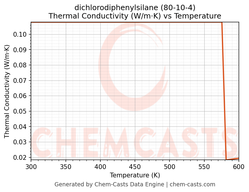 This page presents the temperature-dependent thermodynamic and transport properties of dichlorodiphenylsilane (CAS 80-10-4) calculated at a constant pressure of 1 atm (101325 Pa) over the temperature range 250-500 K.