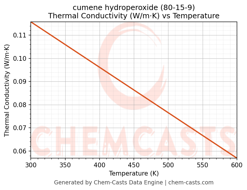 This page presents the temperature-dependent thermodynamic and transport properties of cumene hydroperoxide (CAS 80-15-9) calculated at a constant pressure of 1 atm (101325 Pa) over the temperature range 250-500 K.