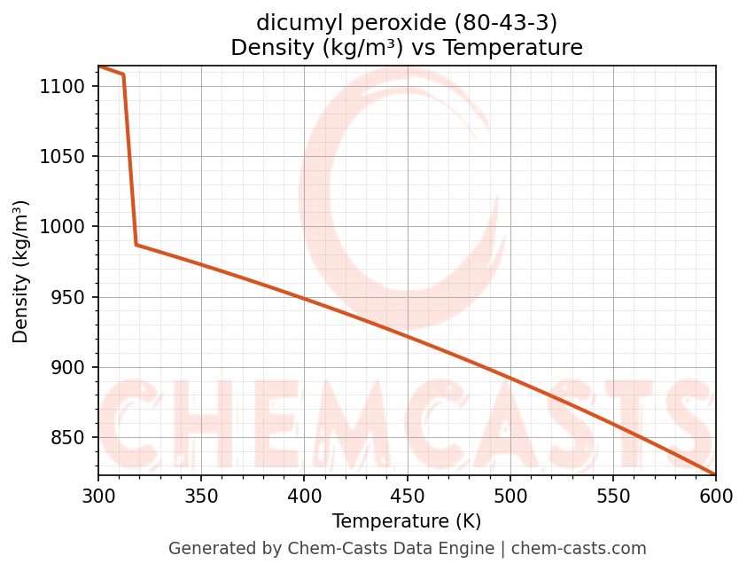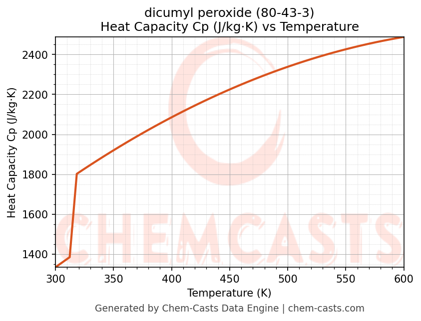 - Specific heat capacity (Cp) indicates the amount of energy required to raise the temperature of dicumyl peroxide and is critical for energy balance and heat-exchanger design.