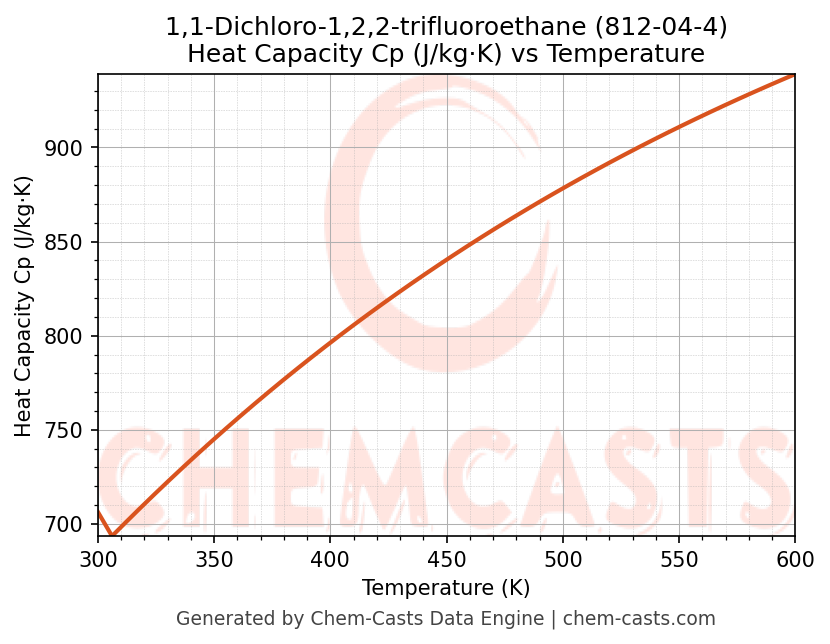 - Specific heat capacity (Cp) indicates the amount of energy required to raise the temperature of 1,1-Dichloro-1,2,2-trifluoroethane and is critical for energy balance and heat-exchanger design.