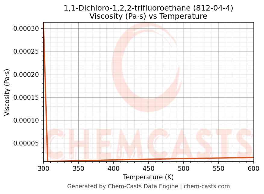 This page presents the temperature-dependent thermodynamic and transport properties of 1,1-Dichloro-1,2,2-trifluoroethane (CAS 812-04-4) calculated at a constant pressure of 1 atm (101325 Pa) over the temperature range 250-500 K.