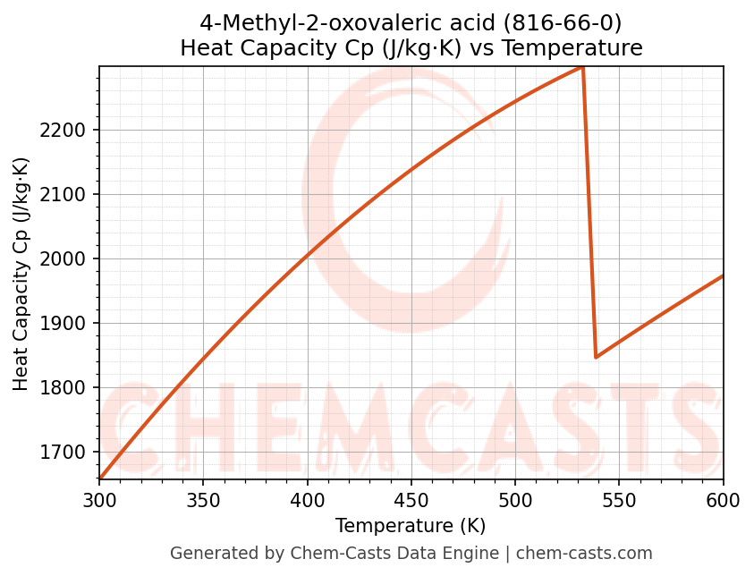 This page presents the temperature-dependent thermodynamic and transport properties of 4-Methyl-2-oxovaleric acid (CAS 816-66-0) calculated at a constant pressure of 1 atm (101325 Pa) over the temperature range 250-500 K.