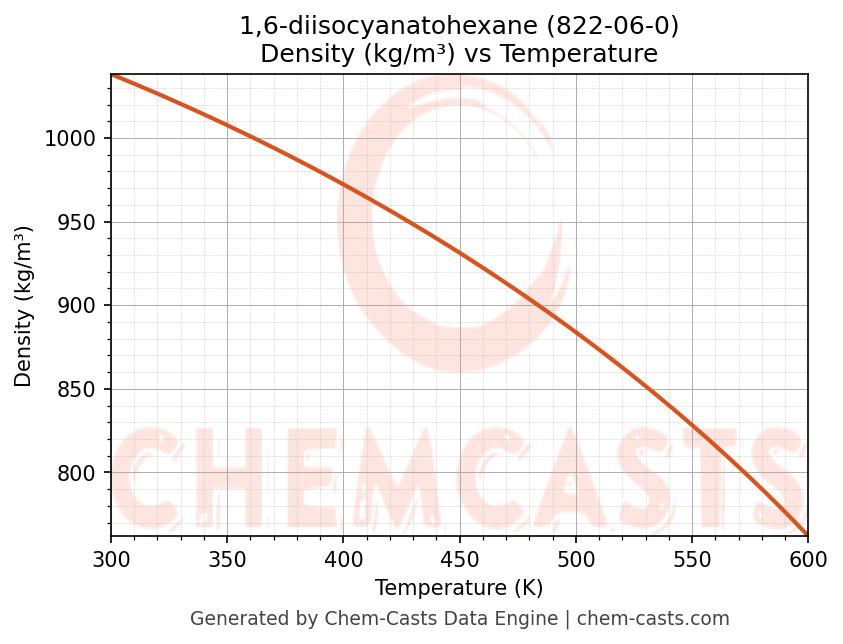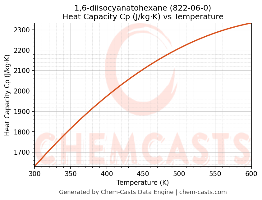 - Specific heat capacity (Cp) indicates the amount of energy required to raise the temperature of 1,6-diisocyanatohexane and is critical for energy balance and heat-exchanger design.