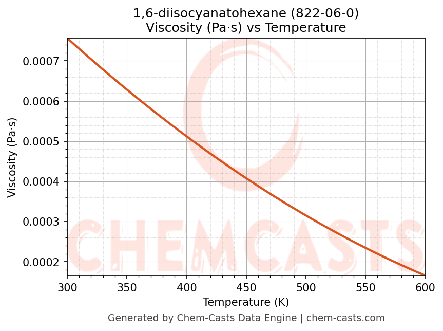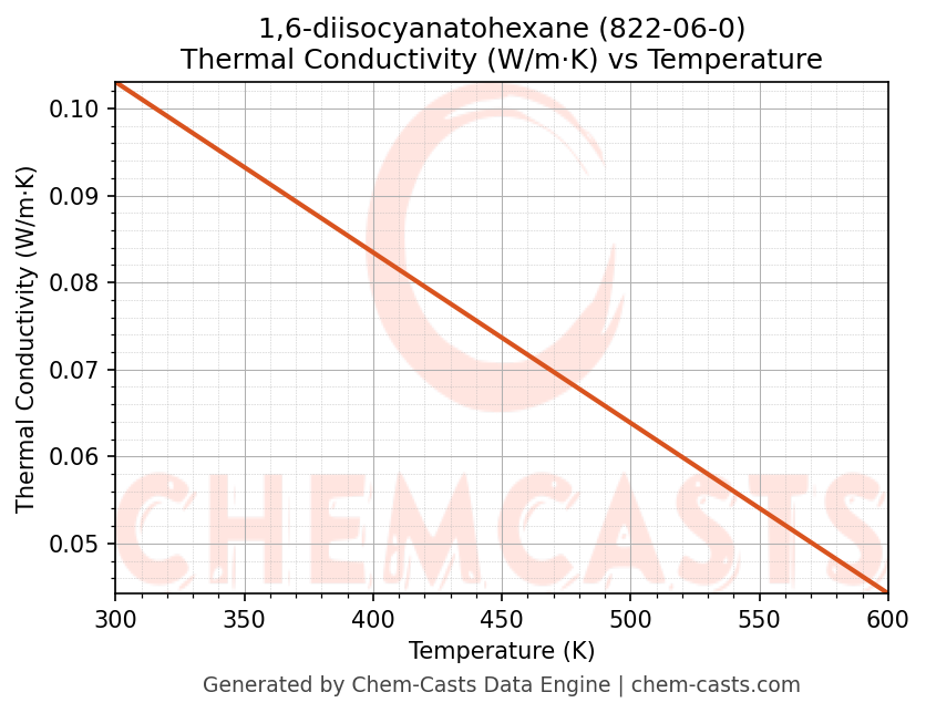 This page presents the temperature-dependent thermodynamic and transport properties of 1,6-diisocyanatohexane (CAS 822-06-0) calculated at a constant pressure of 1 atm (101325 Pa) over the temperature range 250-500 K.