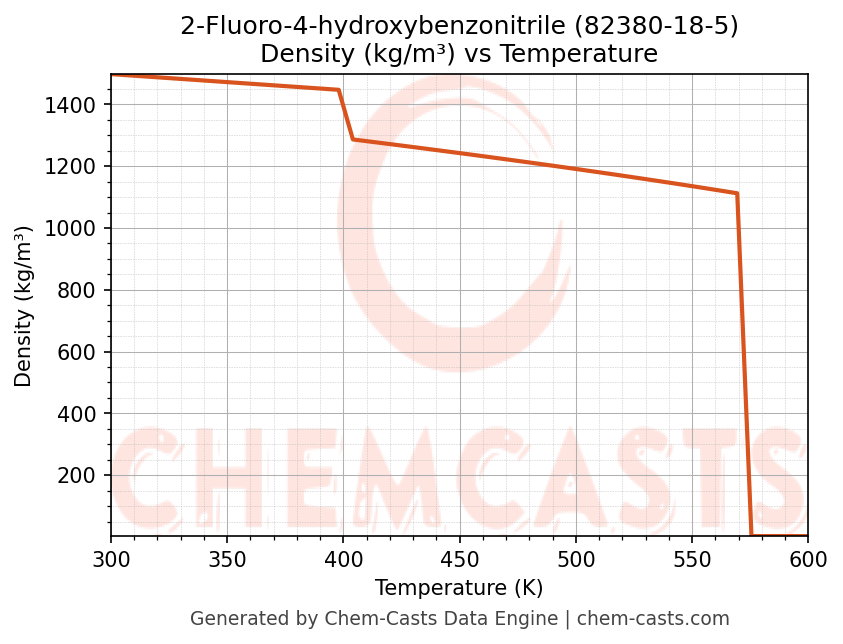 This page presents the temperature-dependent thermodynamic and transport properties of 2-Fluoro-4-hydroxybenzonitrile (CAS 82380-18-5) calculated at a constant pressure of 1 atm (101325 Pa) over the temperature range 250-500 K.