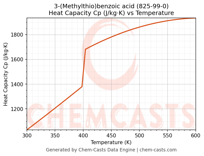 - Specific heat capacity (Cp) indicates the amount of energy required to raise the temperature of 3-(Methylthio)benzoic acid and is critical for energy balance and heat-exchanger design.