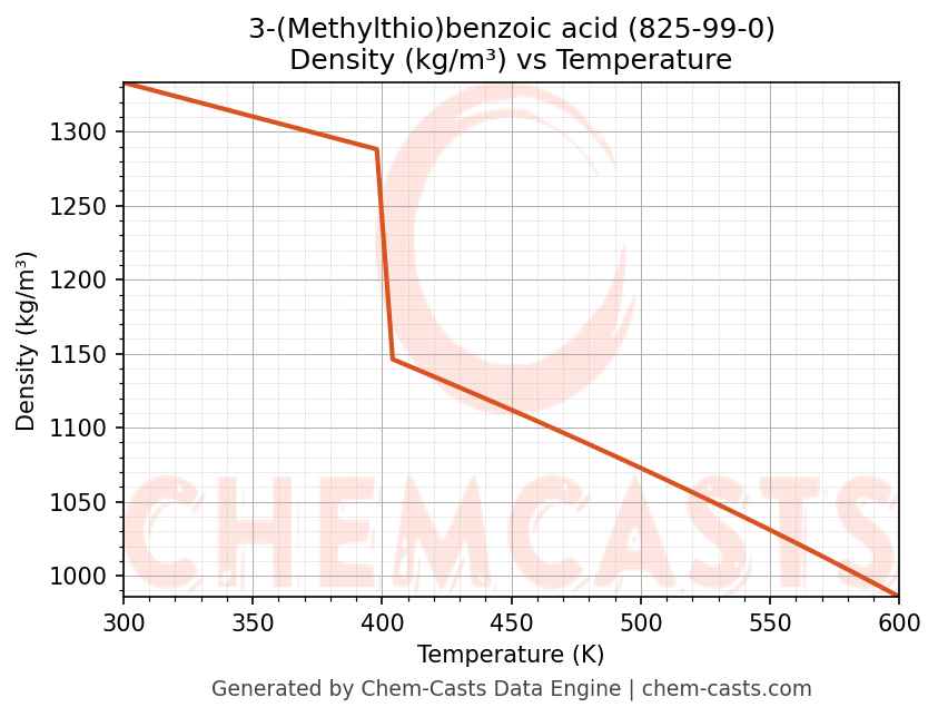 This page presents the temperature-dependent thermodynamic and transport properties of 3-(Methylthio)benzoic acid (CAS 825-99-0) calculated at a constant pressure of 1 atm (101325 Pa) over the temperature range 250-500 K.