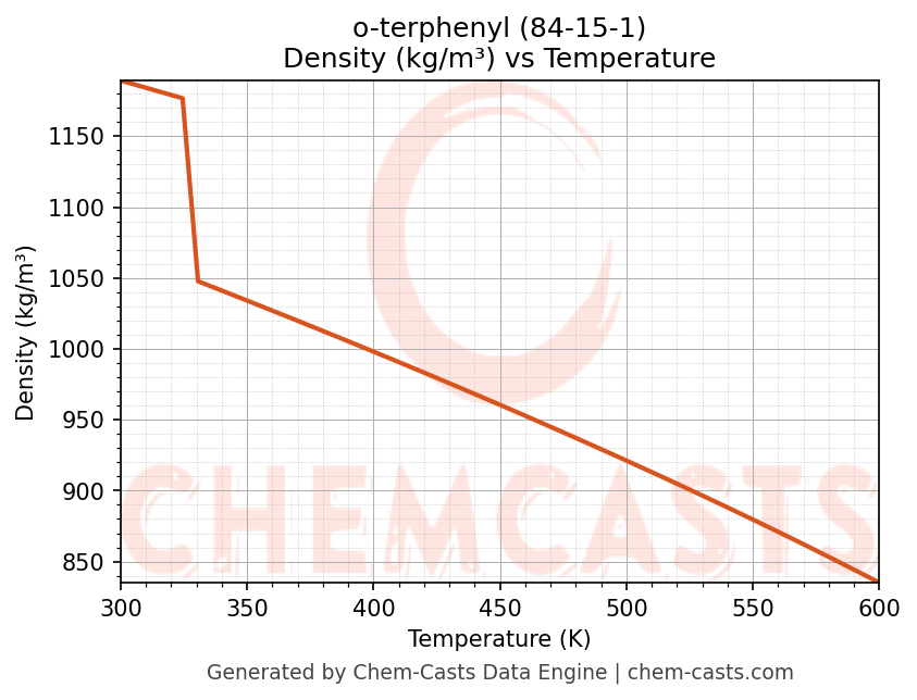 This page presents the temperature-dependent thermodynamic and transport properties of o-terphenyl (CAS 84-15-1) calculated at a constant pressure of 1 atm (101325 Pa) over the temperature range 250-500 K.