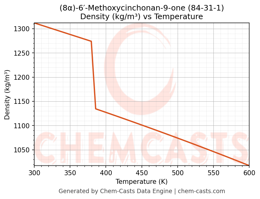 This page presents the temperature-dependent thermodynamic and transport properties of (8α)-6′-Methoxycinchonan-9-one (CAS 84-31-1) calculated at a constant pressure of 1 atm (101325 Pa) over the temperature range 250-500 K.