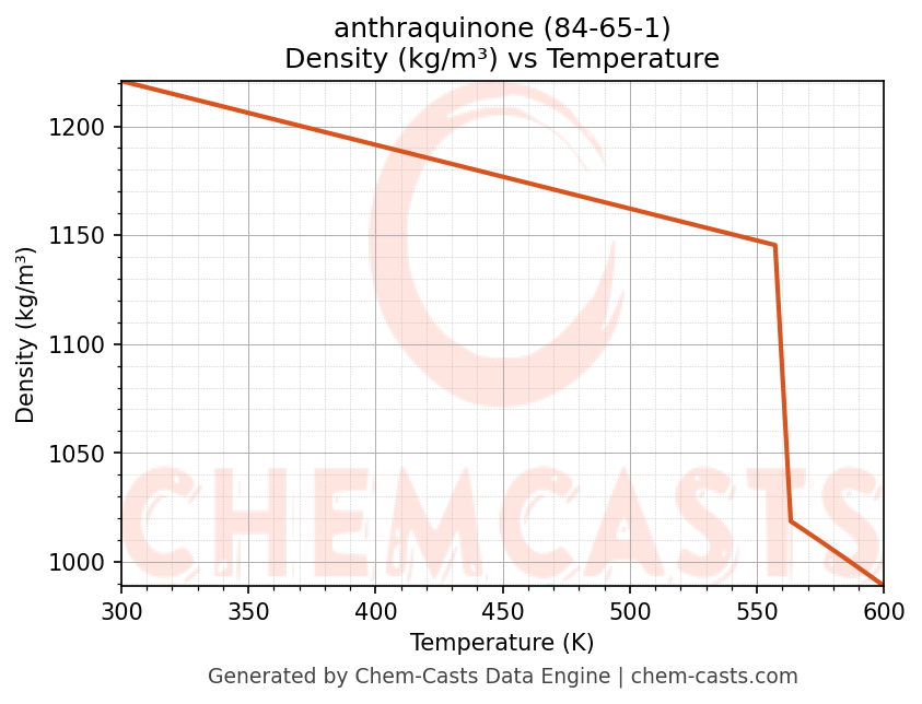 This page presents the temperature-dependent thermodynamic and transport properties of anthraquinone (CAS 84-65-1) calculated at a constant pressure of 1 atm (101325 Pa) over the temperature range 250-500 K.