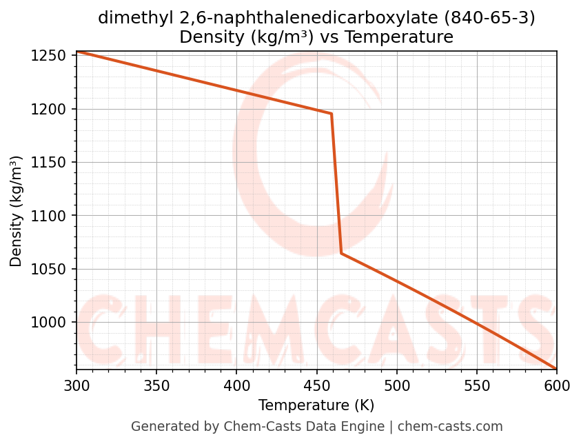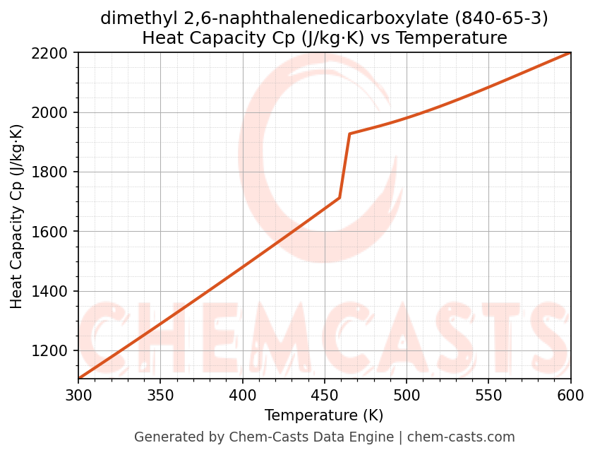 This page presents the temperature-dependent thermodynamic and transport properties of dimethyl 2,6-naphthalenedicarboxylate (CAS 840-65-3) calculated at a constant pressure of 1 atm (101325 Pa) over the temperature range 250-500 K.