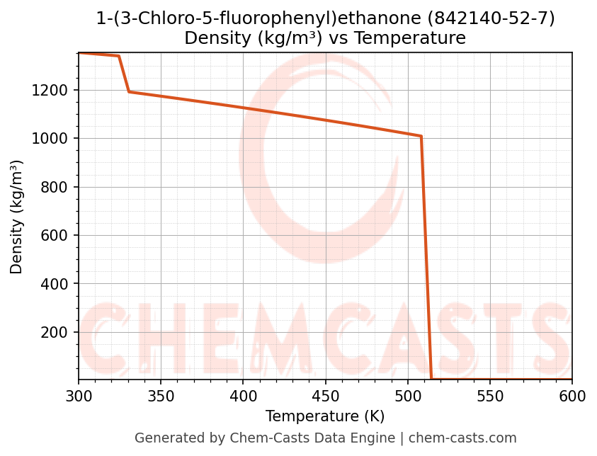 This page presents the temperature-dependent thermodynamic and transport properties of 1-(3-Chloro-5-fluorophenyl)ethanone (CAS 842140-52-7) calculated at a constant pressure of 1 atm (101325 Pa) over the temperature range 250-500 K.